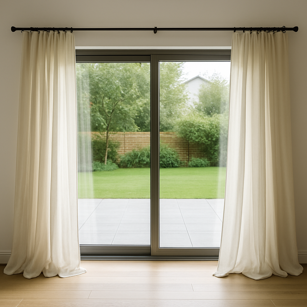 Critical: your curtain panels need to clear the door when it slides open. For a standard 6' sliding door, hang the rod at least 12" past the door on the non-wall side, and allow 16-18" of stackback per panel so the door opening is completely clear.