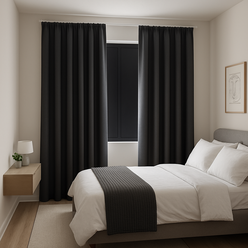 True blackout curtains have a multi-layer construction โ typically a back lining of tightly woven black fabric or foam backing. Look for "triple weave" or "thermal blackout" construction. Single-layer "room darkening" curtains are not the same as blackout.